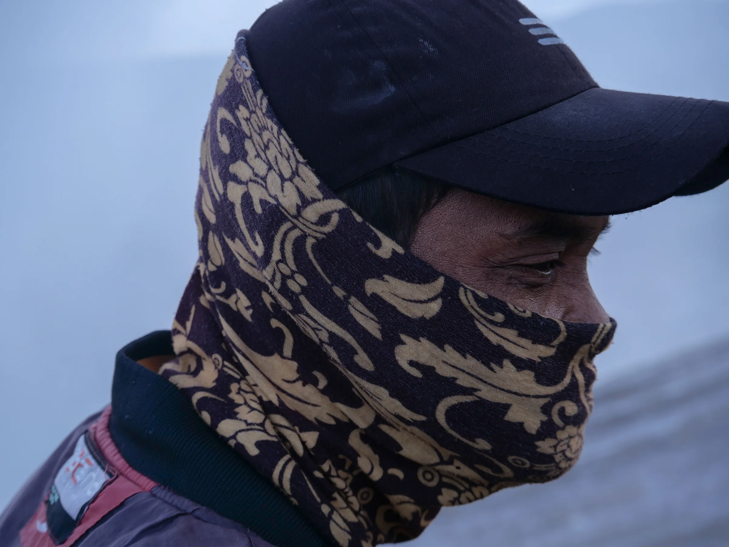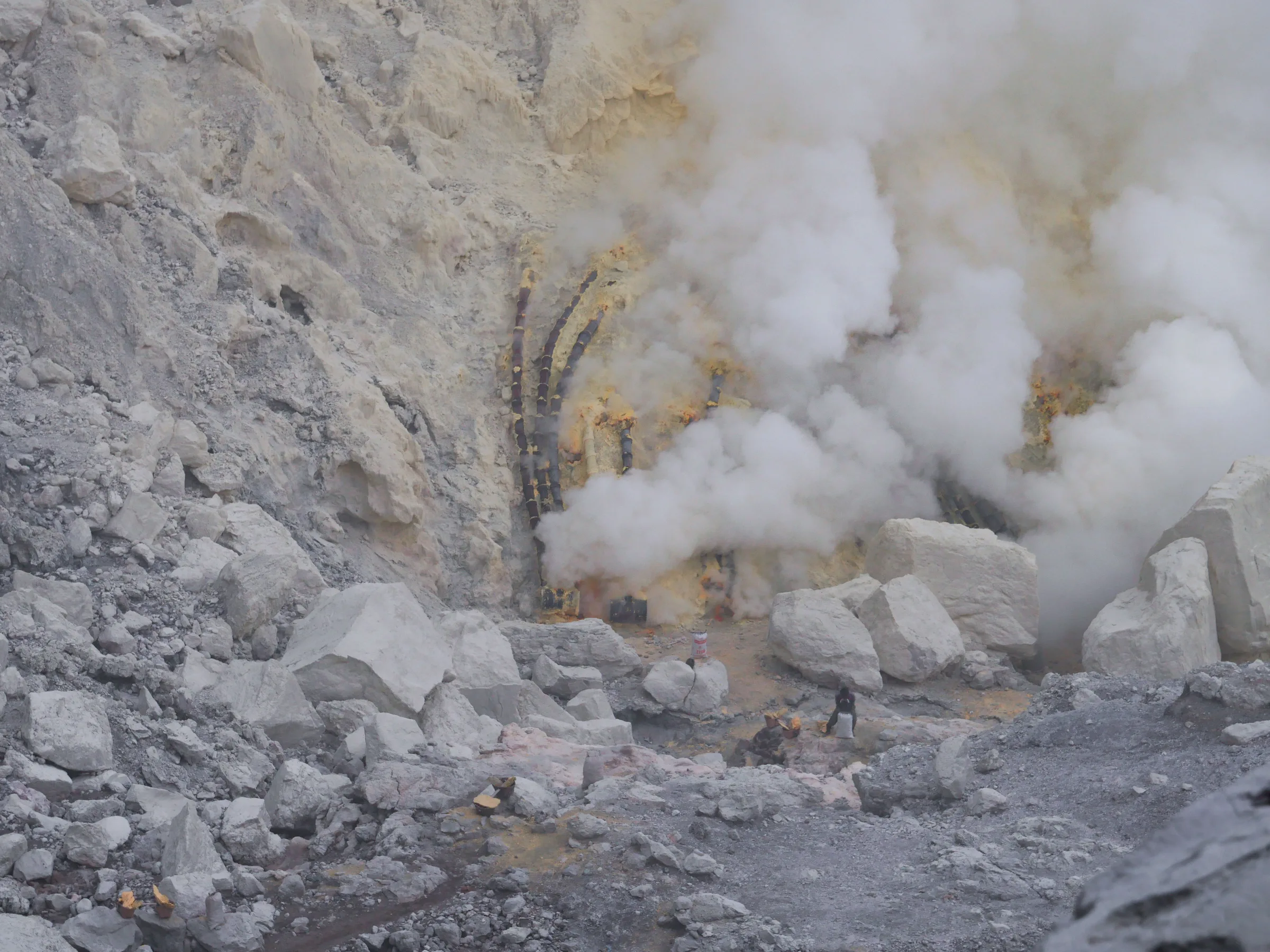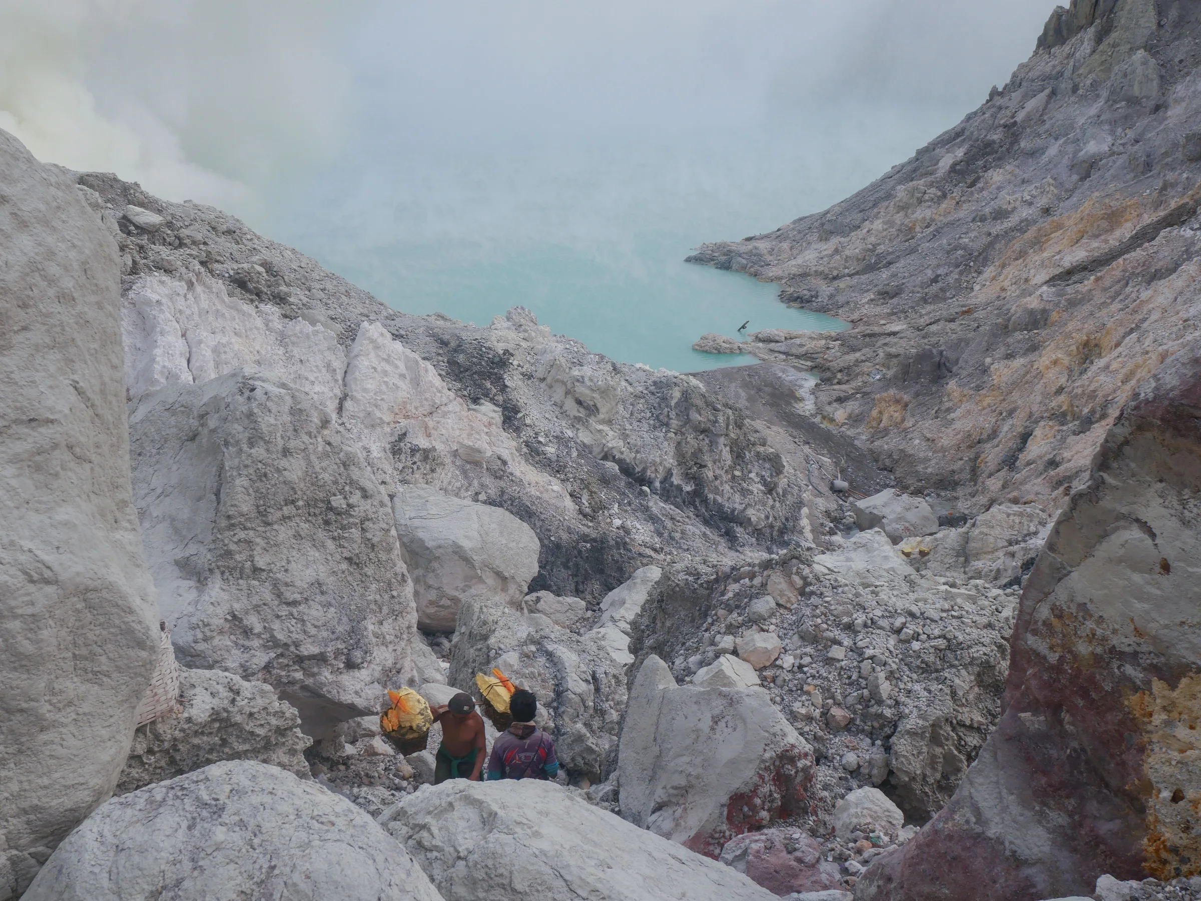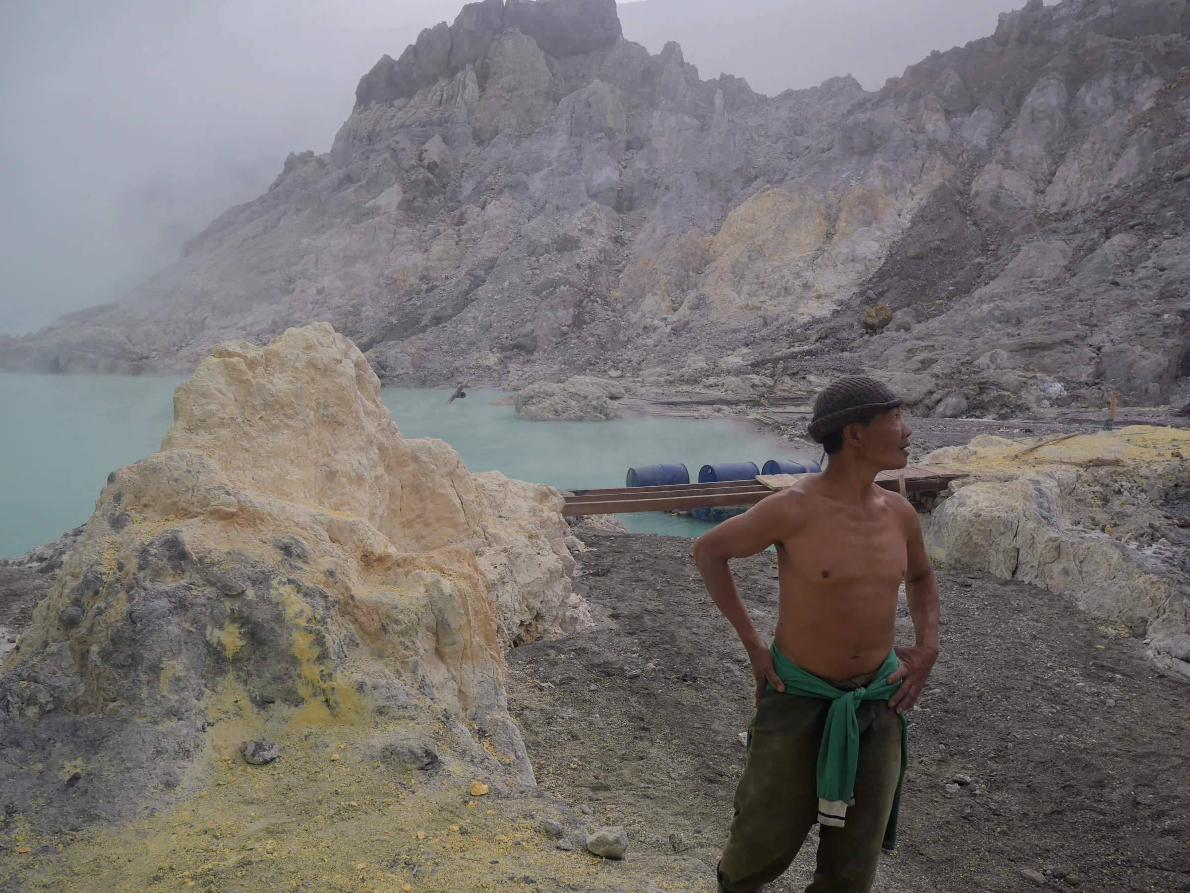 Les porteurs de soufre se trouvent dans des conditions de travail extrêmement dangereuses, tout cela dans le seul but de subvenir aux besoins de leur famille. Ils opèrent sans masques à gaz ni chemins sécurisés pour gravir ce cratère. À proximité de la solfatare, on découvre un lac considéré comme le plus acide de la planète, avec en prime les risques d'effondrements des parois rocheuses. Malgré tous ces périls, ils rejettent l'idée d'automatiser le processus de récupération du soufre, de peur que cela n'entraîne des pertes d'emplois et financières.